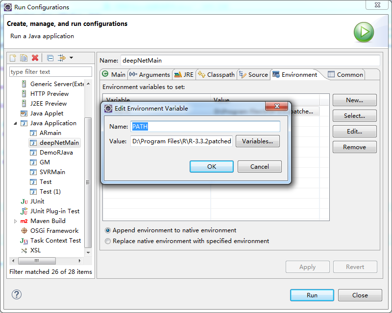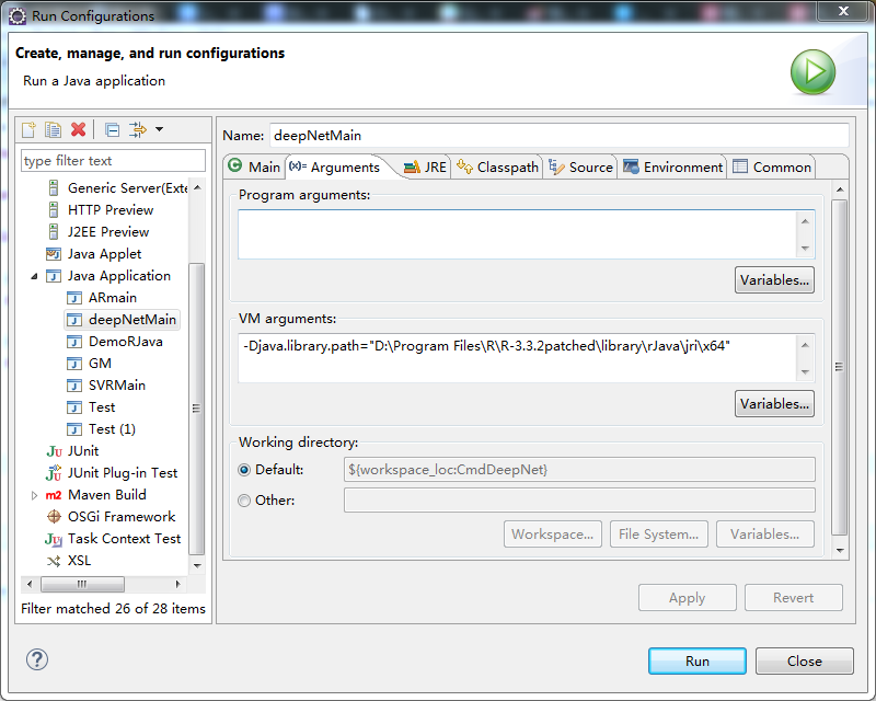 Arguments中添加: -Djava.library.path="D:\Program Files\R\R-3.3.2patched\library\rJava\jri\x64" Enviornment中添加:PATH D:\Program Files\R\R-3.3.2patched\bin\x64 (此处仍需要注意系统版本是64位还是32位)