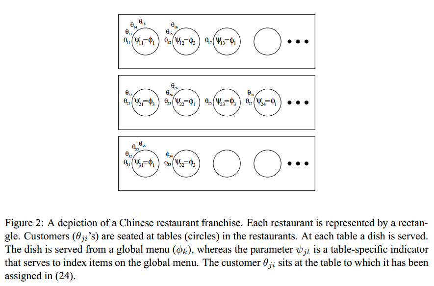 ####中餐馆特许经营(Chinese Restaurant Franchise) 我们都知道,Dirichlet过程是关于分布的分布,从DP本身的定义中,我们是无法构造一个Dirichlet过程的。层次Dirichlet过程也是一样。这里作者引用了一个叫“中餐馆特许经营”(Chinese Restaurant Franchise,CRF)的构造过程(暂时未看到CRF的直接中国翻译,我们就以这样的名字暂定)。假设我们有个有特许经营权的中国餐馆。我们在很多地方都开了这种餐馆,并且他们都拥有相同的菜单。每个特许经验的餐馆中都有无数多的桌子,每个桌子上可以做无数多的人。第一个顾客进来之后选择了一个桌子,并点了一道菜。第二个顾客进来之后既可以选择第一个桌子,也可以选择第二个桌子,这里有一个概率。注意,每个桌子的后来者点的菜都是与坐该桌子第一个顾客点的菜一样,因此,当第二个顾客坐在第一个顾客那张桌子后,菜就不用新点了。而当用户坐在第二张桌子上之后,就要重新点个菜了。这时候,点的菜既可以是和第一张桌子一样,也可以是新的,这也是一个概率选择的问题。不同的桌子可以点到相同的菜,不同餐馆的不同桌子也可能点到相同的菜。一直下去,直到所有的用户落座就结束了。这里每个餐馆$j$都相当于一组数据,每个客户都是一个数据点所属的混合分布的参数$\theta_{ji}$,每个桌子都有个指示变量$\psi_{jt}$,它对应着一道菜$\phi_k$,这道菜就是我们之前理解的文档中的主题了,它就是来自于$H$的大家共享的一个参数(注意,这里实际上$\phi_k$是来自于$H$分布的一个抽样结果,也就是我们之前说的每个数据点来自的分布$F$的参数$\theta$,$\psi_{jt}$只是一个指示变量,表明每个客户是来自哪个主题$\phi$的)。因此,该过程一句话就是顾客$i$走进餐馆$j$,坐在了桌子$t_{ji}$边,而餐馆$j$中的这个桌子$t$对应着一道菜$k_{jt}$。