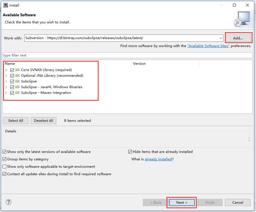 Name可以随便写,可以写Subversion,然后点击确定,等到获取了所有的插件列表后,勾选这些插件,点击下一步,然后接受协议,一步一步安装就好了。