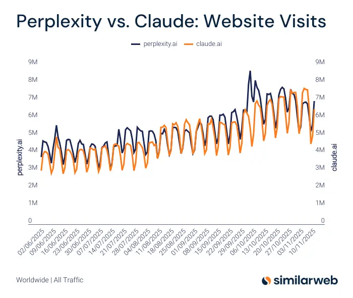 二、Claude 超越 Perplexity:专业用户偏好开始出现迁移