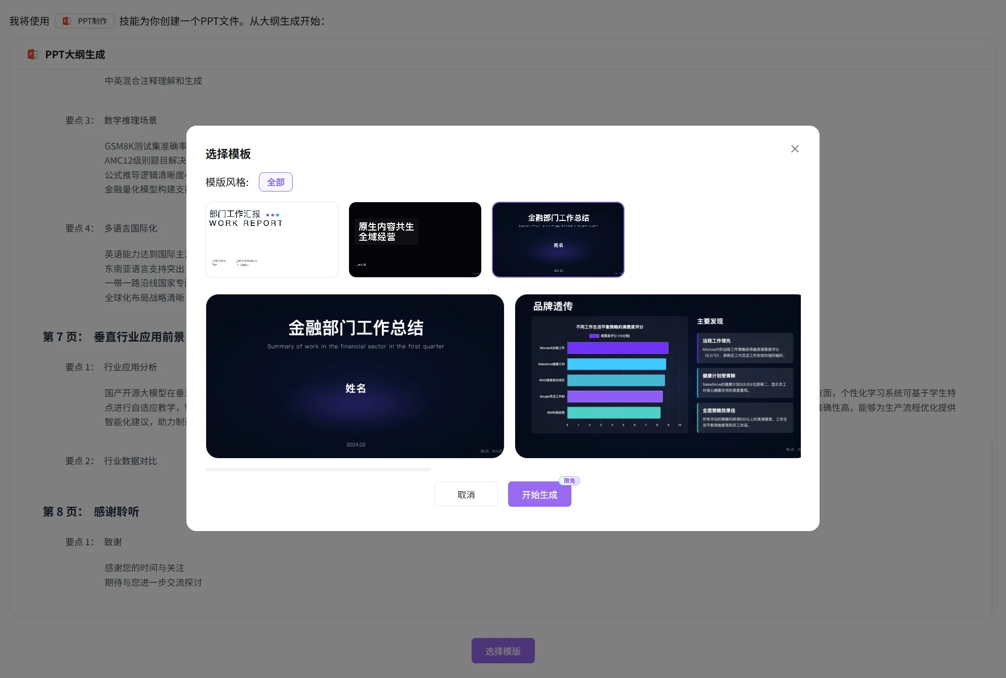 基于前面的内容点击生成PPT即可,这里也是交互式的,需要明确你的诉求之后才能继续。当然,这并不意味着它能替代深度设计,但对于大多数职场使用场景来说,“清晰、干净、结构明确”已经足够应对 80% 的内部场景。