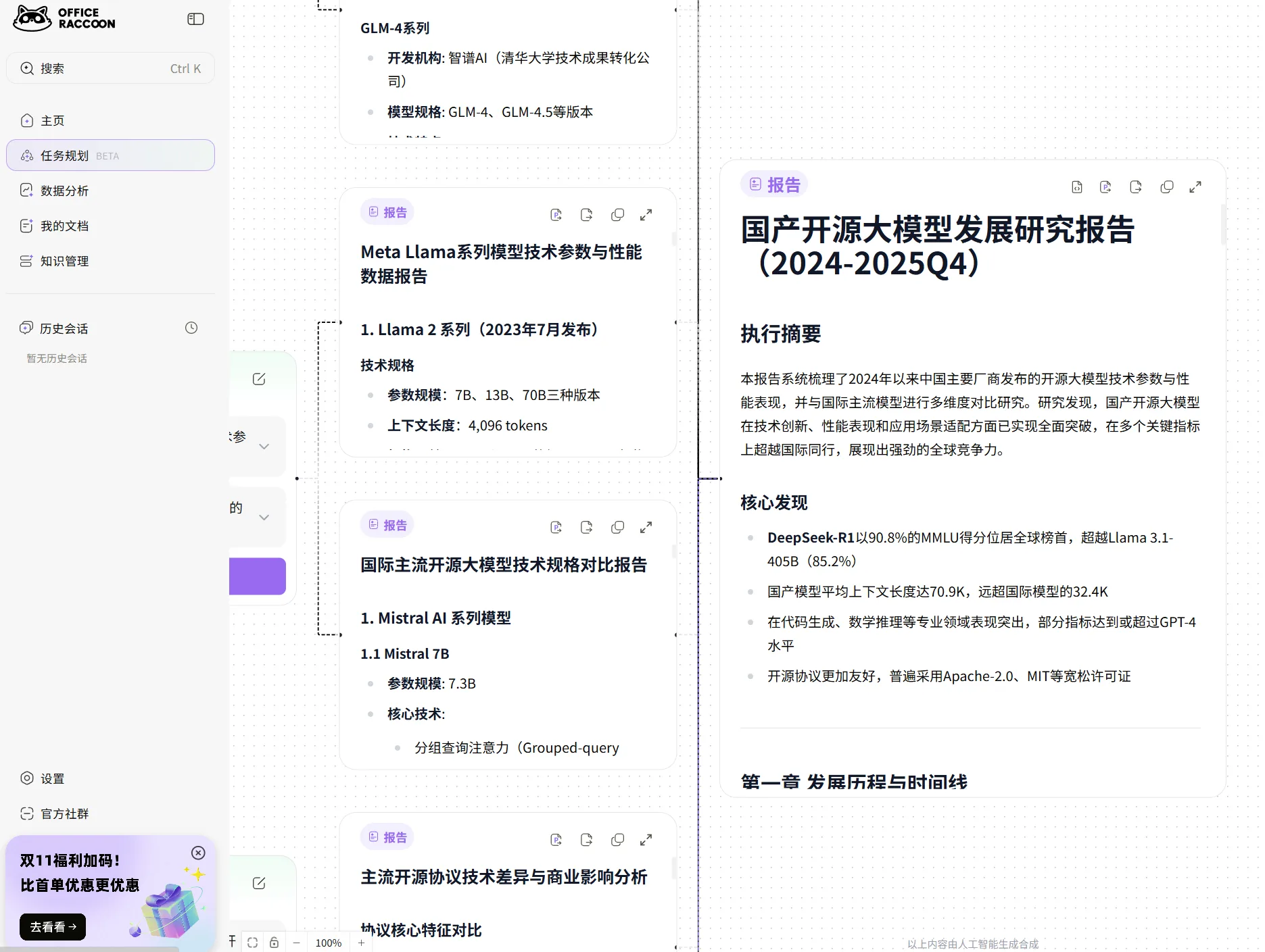 本文主要看一下办公小浣熊这个颇具代表性的大模型应用落地思路。办公小浣熊是商汤科技(对,就是几年前很著名的AI四小龙之一)推出的一个新的大模型办公辅助产品,试图从报告生成、数据分析、PPT生成的方面来落地大模型的应用。它不是唯一的选择,却很好地展示了大模型如何真正贴近用户工作流——不是炫技,而是帮用户减少那些本不该占用如此多时间的步骤。