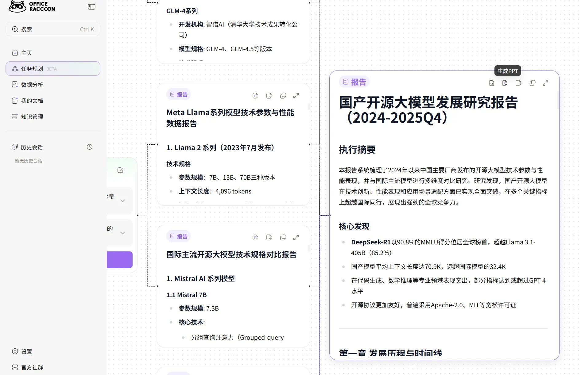 另一个比较重要的功能是生成PPT,这个应该是很多打工人的痛点了,此前,我们介绍过海外较早专门生成PPT的海外产品GammaAPP,不过那个是收费产品,而小浣熊办公是可以目前免费生成的。此外,在小浣熊的工作流里,这不是一个独立能力,而像是报告写作的自然延续。