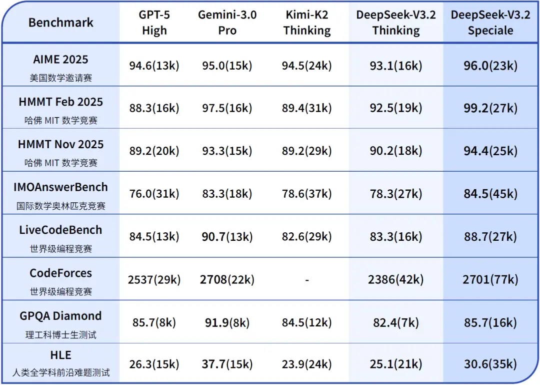 DeepSeek V3.2-Speciale 在架构上延续了 DeepSeek V3.2,但在训练目标上故意放宽了对输出长度和计算成本的约束,并注入了 DeepSeek-Math V2 的大量数学证明数据和奖励机制。结果是,它在多种数学与代码推理基准上表现与 Gemini 3.0 Pro 不相上下,甚至在部分测试中有超越。