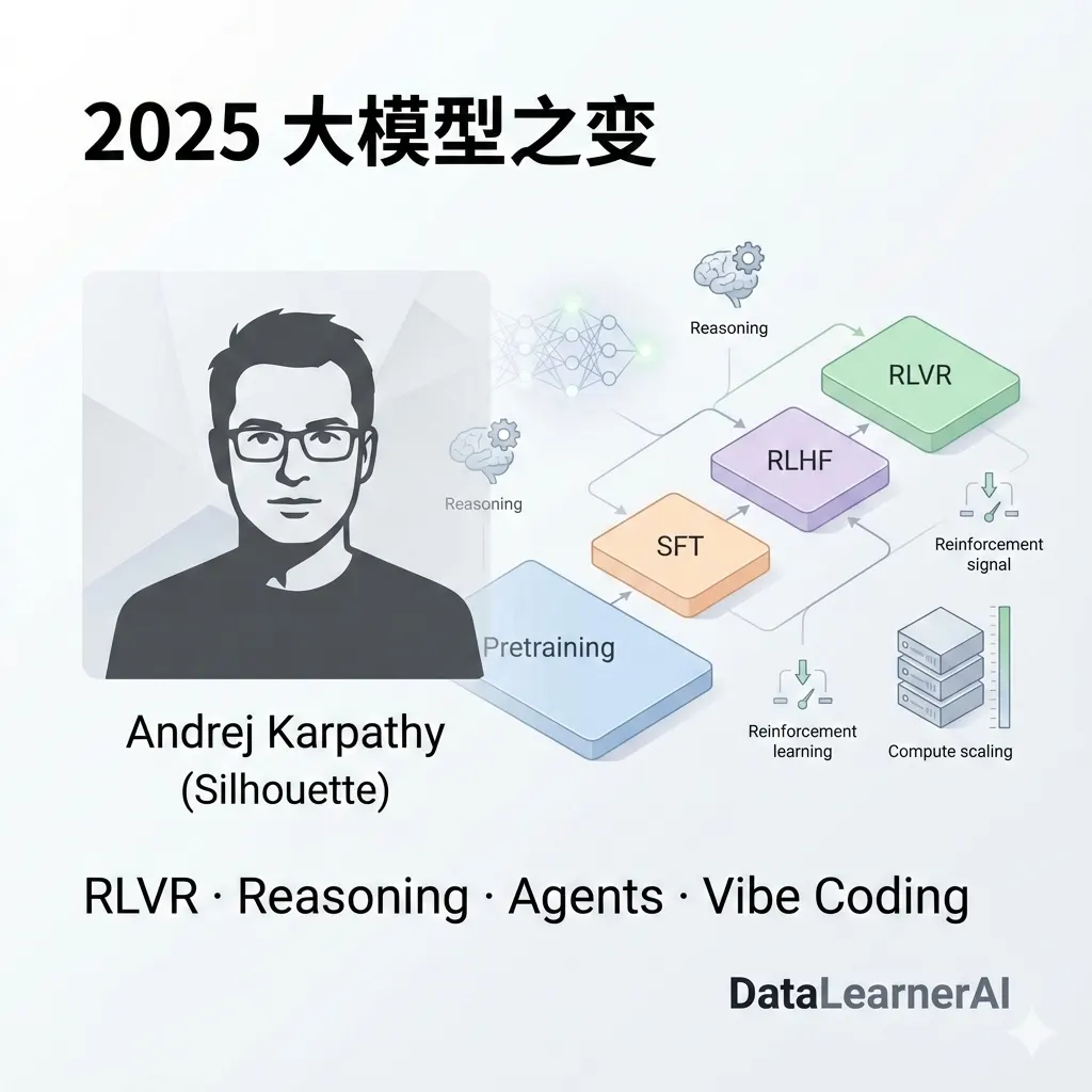 昨天,Karpathy 发布了《2025 LLM Year in Review》,对过去一年大模型领域发生的结构性变化进行了深度复盘。在这篇总结中,他不再纠结于具体的模型参数,而是将目光投向了推理范式的演进、Agent 的真实形态以及一种被称为“Vibe Coding”的新型开发模式。