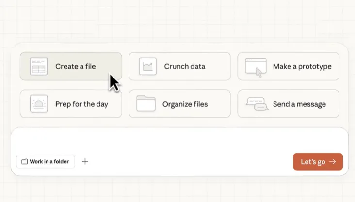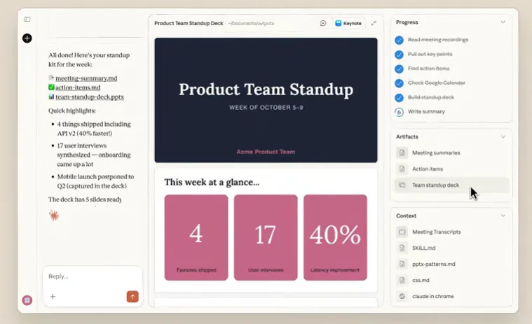 - 任务代理与规划: 用户设定目标,Claude 自动分解步骤、执行并反馈。例如,整理下载文件夹、从截图提取费用生成表格,或整合笔记起草报告。这源于 Claude Code 的计划模式,但更注重用户友好。