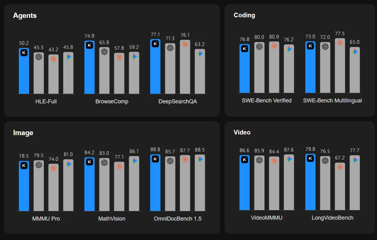 在数学推理 AIME 2025 测试中,其得分高达 96.1。在视觉能力上,它在 MMMU-Pro 和 VideoMMMU 等榜单上也表现优异。此外,在 SWE-Bench Verified 等代码生成评测中,K2.5 也凭借其视觉辅助编程能力取得了领先成绩,证明了其在处理真实世界软件工程任务时的可靠性。