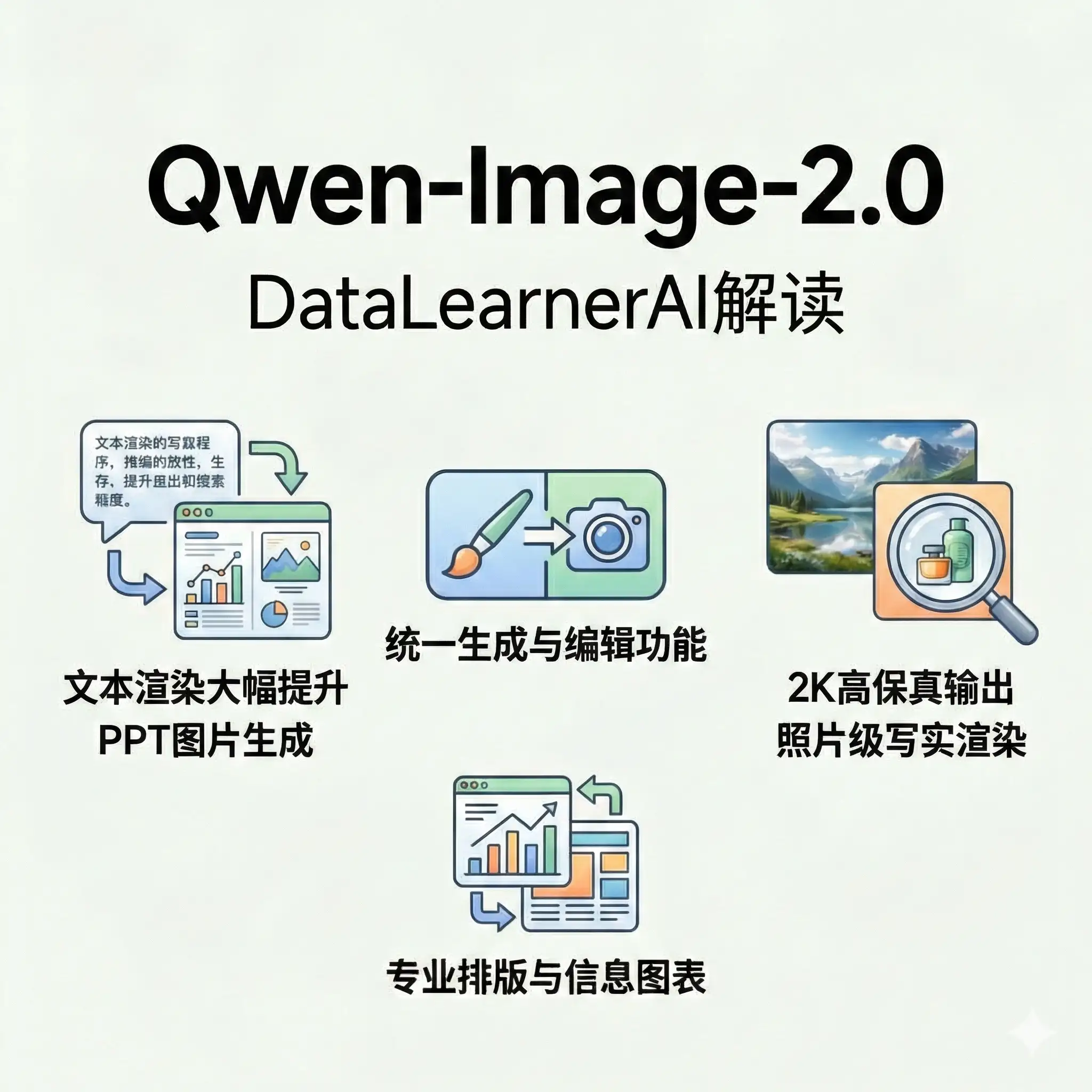 关于Qwen-Image-2.0 的更多信息参考DataLearnerAI的模型信息卡:https://www.datalearner.com/ai-models/pretrained-models/qwen-image-2-0