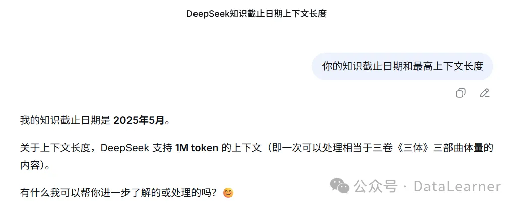 DeepSeek官网模型疑似更新为DeepSeek最新版,实测显示非此前的DeepSeek V3.2,最高支持100万tokens输入,以及知识截止日期为2025年5月,疑似全新模型