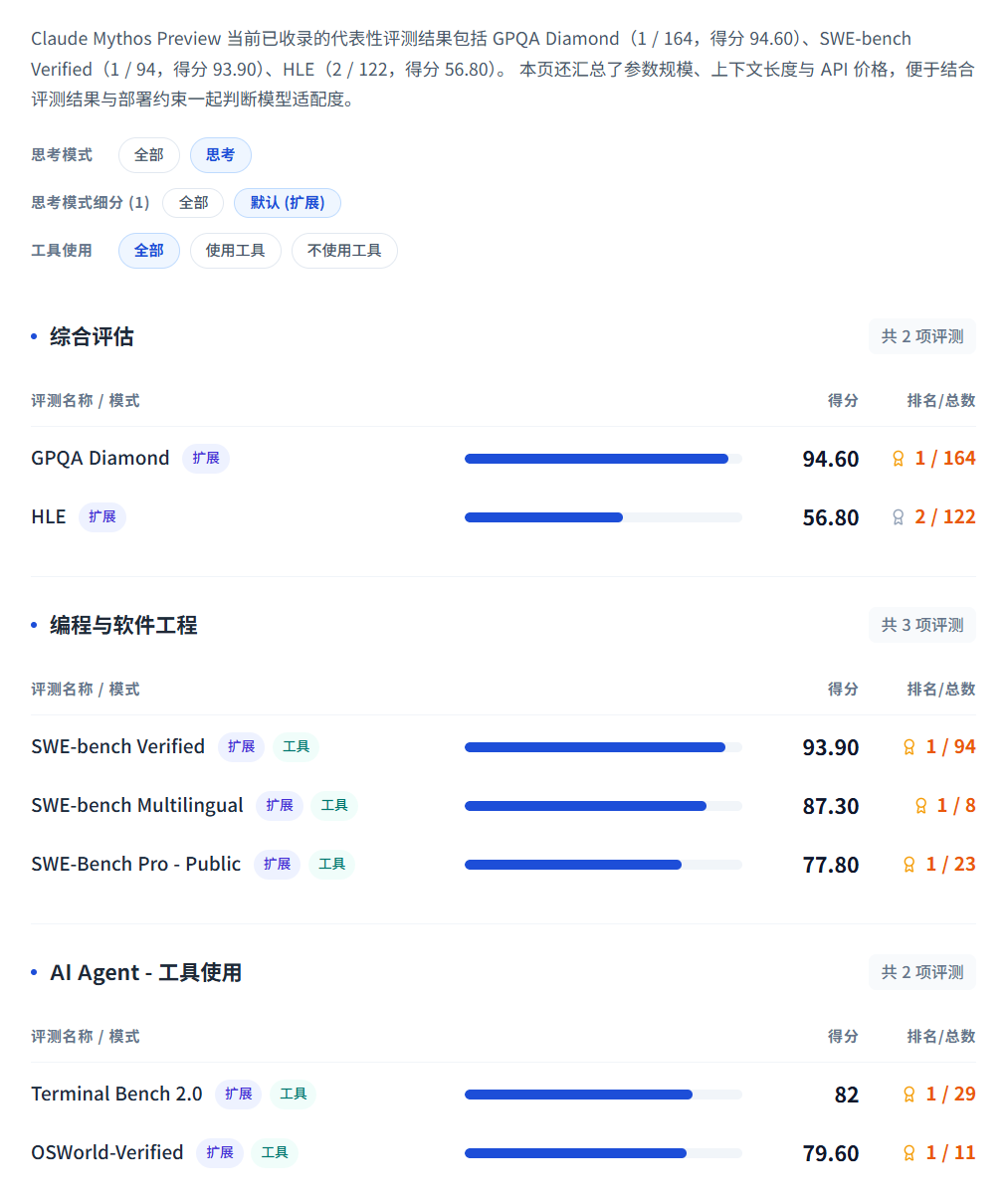 Mythos详细评测数据来源:https://www.datalearner.com/ai-models/pretrained-models/claude-mythos-preview/analysis