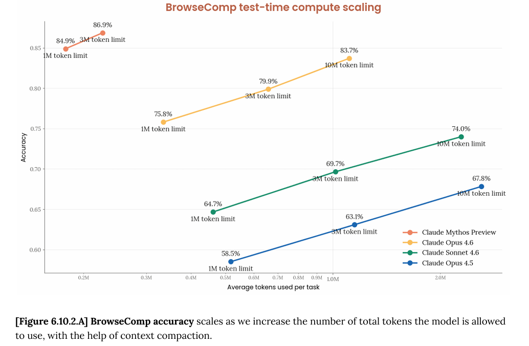 Claude Mythos的tokens效率也很高 在Claude Mythos官方的技术文章中还有一个图很有意思,就是BrowseComp 测试结果: