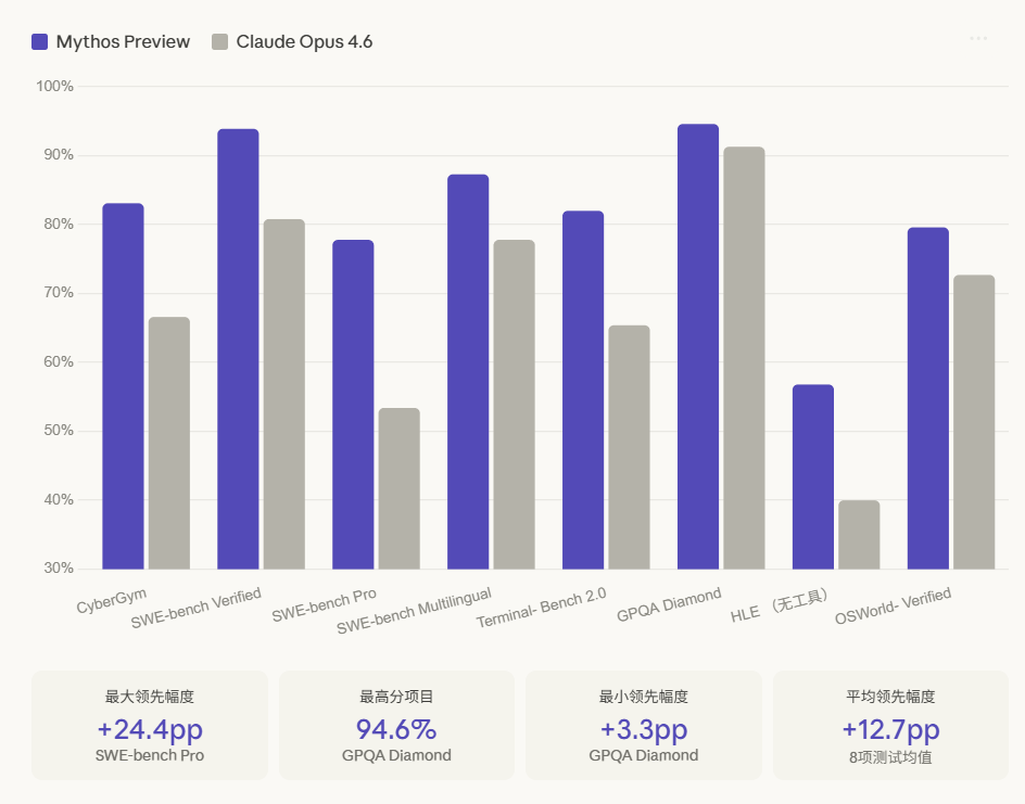 这意味着 Anthropic 实际拥有的能力,很可能远超过公众目前所能看到的。Mythos 从 2026 年 2 月就开始内部测试,正式宣布时距离 Opus 4.6 的发布只过去了2个月。Opus 4.6 本身已经是当前公开模型里的第一梯队,而 Mythos 在几乎所有维度上都与它拉开了显著差距——这个差距不是小步迭代,是跨层级的跃升。