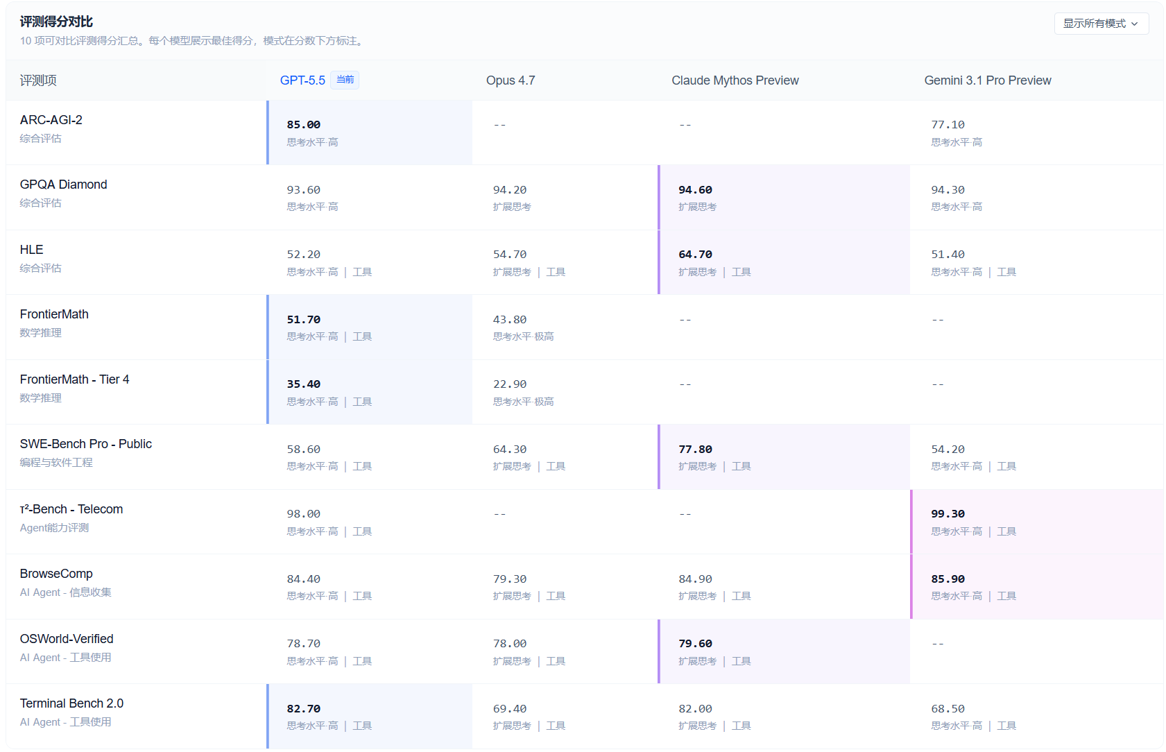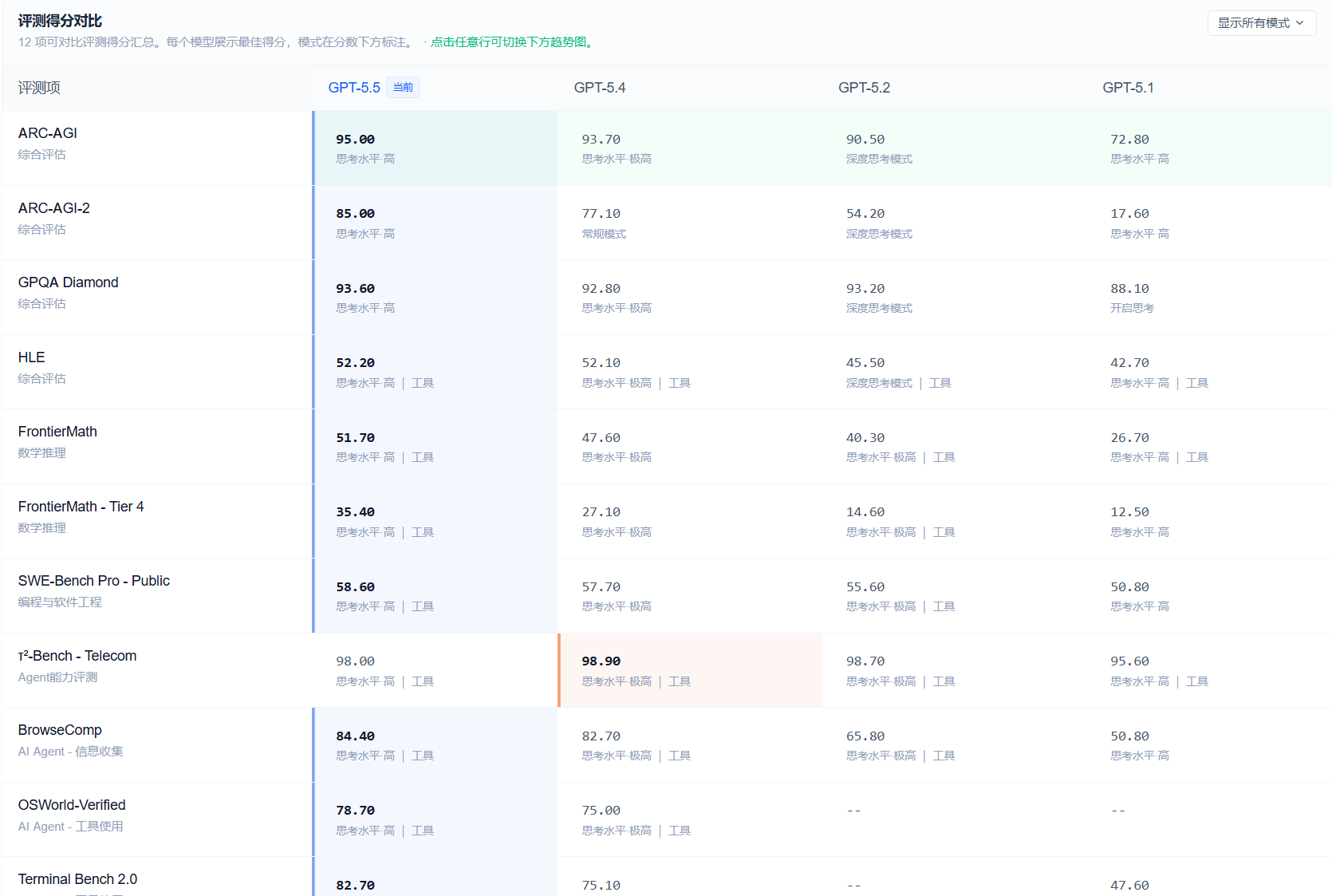 GPT-5.5基准测试情况:Agent 场景领先,纯推理存在明显差距