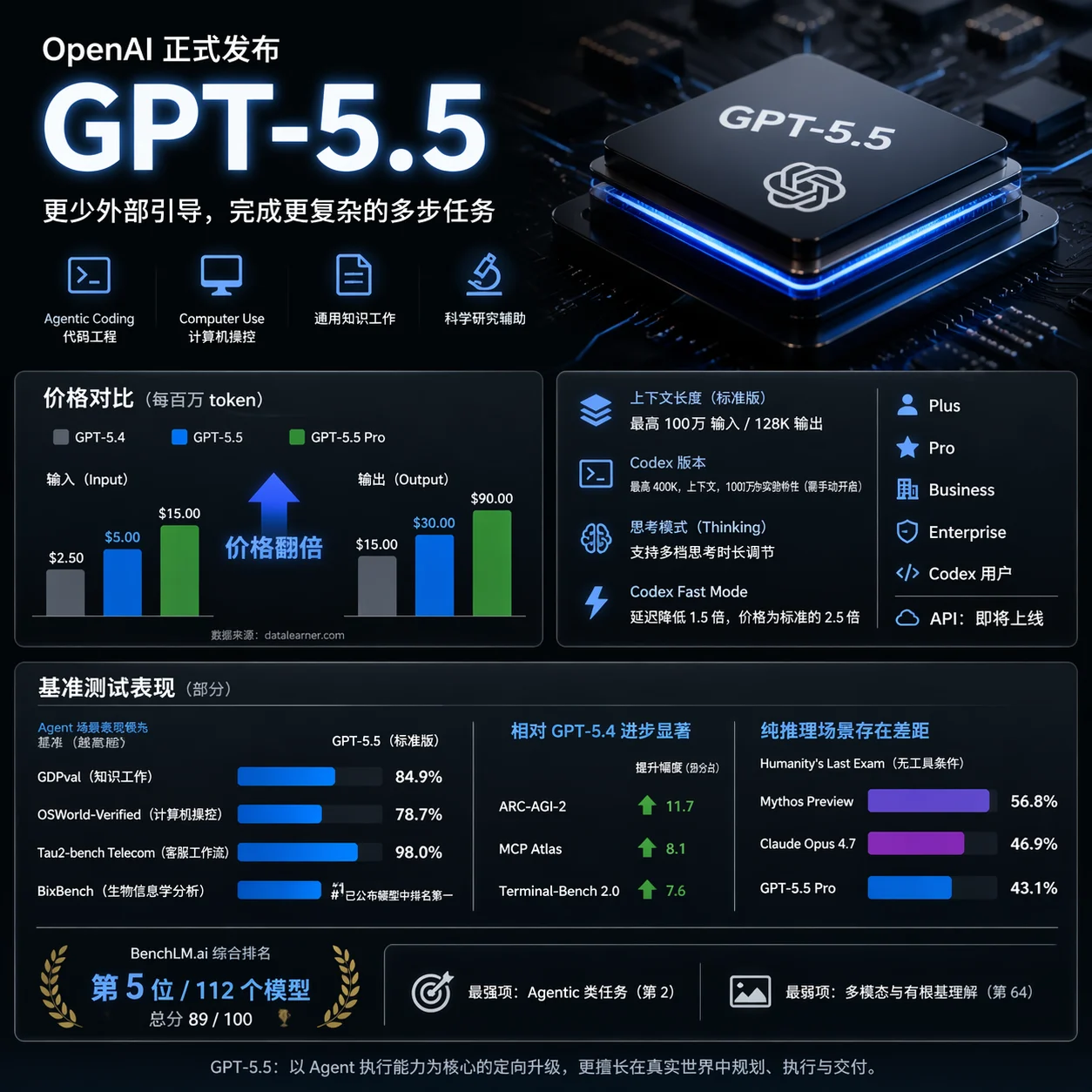 简单总结一下,GPT-5.5 是一次以 Agent 执行能力为核心的定向升级,不是全面碾压式的代际跃迁。ARC-AGI-2、MCP Atlas、Terminal-Bench 2.0 的增益,加上 OSWorld-Verified 78.7%,指向的是一个在实际工程和任务自动化场景里更可用的执行型模型。和Qwen 3.6版本的升级很类似。或许,大模型的通用能力已经达到一个瓶颈了也说不定。